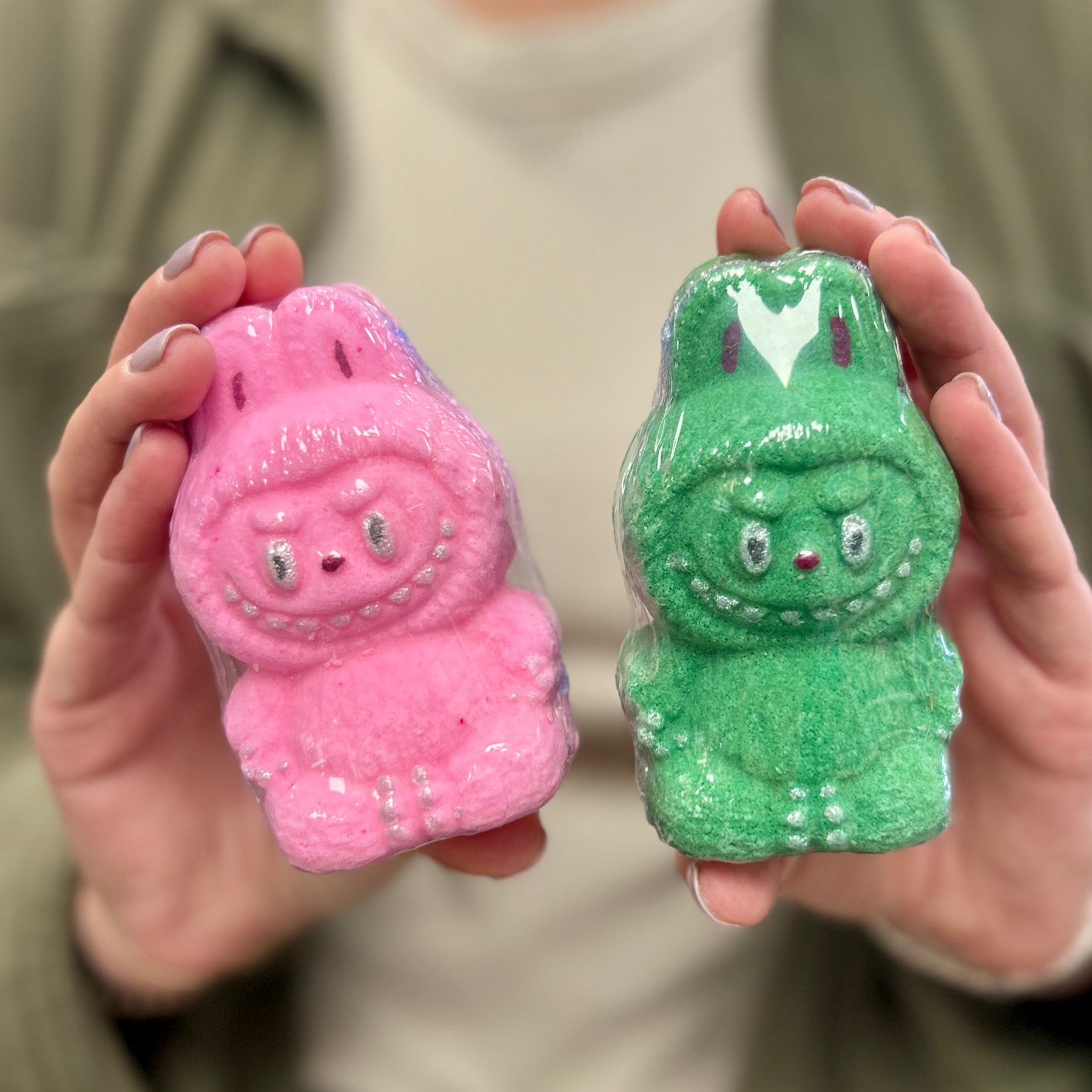 these Labubu inspired bath bombs come in a variety of pastel colors and scents! while we cannot guarantee which color you will receive, we promise it will be a winner